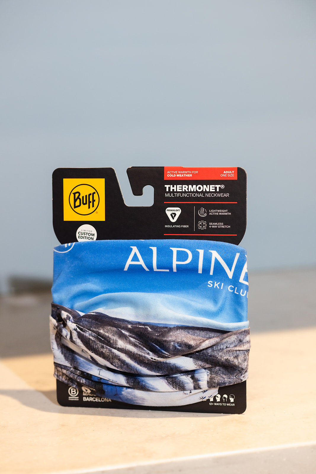 Who needs a trail map when you can literally wear the whole hill? This custom BUFF features a stunning winter drone shot of Alpine from above — frosted trees, winding runs, and all the glory of your favourite slopes. Lightweight, versatile, and endlessly useful: neck warmer, headband, face cover, or that thing you pull up when you spot someone you don’t want to talk to in the lift line. Consider it the most scenic gear you’ll ever own.